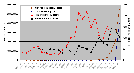 The current agricultural marketing policies have adversely affected the production of maize, wheat and other controlled crops due to unintended market distortions. There seems to be little incentive for farmers to produce beyond their subsistence needs, given the lack of alternative marketing channels and price controls with inflexible procurement prices in an environment of hyperinflation. The Grain Marketing Board (GMB), a Government monopoly agency, buys and sells major cereals at controlled prices (further details on this are given in Section 4 on Markets).