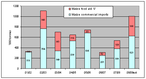 External trade and food import potential: The declining trend in total exports (which comprise mainly of tobacco, sugar, horticultural products, platinum, gold and diamonds) and the rising value of imports (fuel, electricity, food, chemicals, etc.) have led to an increased trade deficit. The trade deficit obviously cannot be used to acquire imports indefinitely without having the means to cover them. Hence imports of consumer goods have been reduced almost to a trickle and the economy is ravaged due to shortages of fuel, electricity, fertilizer and spare parts for machinery and irrigation equipment. Production of tobacco was slightly better in 2007 after reaching an all-time low in 2006 but is estimated to decline in 2008 again. The sugar sector has performed poorly. Thus, the prospects for 2008 exports are not very good. The first quarter exports at USD 431 million were estimated to be some 9 percent lower than the year before (RBZ). This and the current year’s food crisis, leading to a higher food import bill, are expected to stretch the limits of the country’s economic wellbeing. Specific implications to food imports are discussed later in this report (section 5).