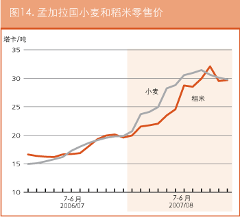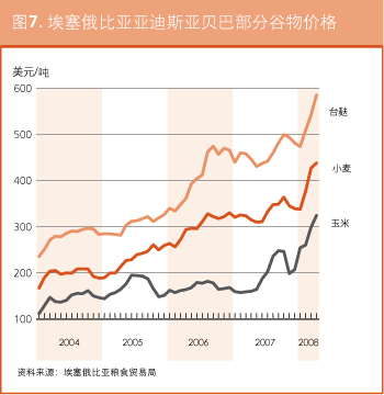 在厄立特里亚,在国际市场普遍上涨的影响下,阿斯马拉的粮食价格自2007年7月以来一直在稳步上扬。2008年5月面粉的零售价为每100公斤3700纳克法,比上个月增长了约9%,比去年同期涨了一倍还多。同样的,玉米的零售价在2008年5月为每100公斤2700纳克法,比2007年7月升了一倍。在埃塞俄比亚,虽然2007年底略有下跌,但2008年间谷物价格持续上扬。亚的斯亚贝巴的小麦价格从3月的426美元/吨涨至4月的438美元/吨。4月玉米的报价为324美元/吨,而去年同期仅为160美元/吨。随着价格的持续攀升,预计贫困农户将更难确保获得充足的粮食供应。