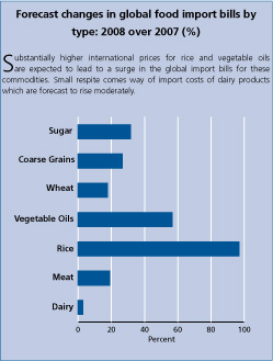 MARKET INDICATORS AND FOOD IMPORT BILLSFalling food prices and freight costs fail to dent a USD 1 trillion bill in 2008 As 2008 draws to a close, the global cost of imported foodstuffs in 2008 is increasingly likely to break the USD1 trillion barrier. The prediction comes in spite of sharp falls in freight rates and pervasive declines in international prices of foodstuffs that began mid year and accelerated thereafter. At USD 1019 billion, the total food import bill facing the world would be some 23 percent higher than in 2007 and 64 percent the year before that. Of the estimated USD 200 billion or so global increase from 2007, vegetable oils could account for over one-third of the rise and coarse grain based foodstuffs for about a quarter. In fact, with the exception of sugar, expenditures on imported food by commodity group are all estimated to reach unprecedented levels. International quotations, which even in the face of recent declines, remain much higher than last year constitute the main driver of record import bills in 2008. Freight charges have also been a factor, despite the near collapse in quotations in recent months. Hitherto, freight costs had been soaring, reaching unparalleled levels in mid 2008, adding on average roughly 10 percent to import expenditures since last year. The third variable in the import equation - volume - has held remarkably firm in the wake of such high unit costs. The global market for wheat, vegetable oils, meat and dairy products all should experience record traded volumes in 2008, while world trade in rice and coarse grains could all but register the highest levels, bar 2007. Such resilience bears testimony to the importance of trade to assure food consumption around the world. However, the global picture masks significant difficulties that vulnerable countries are likely to endure. Record increase in food import bills of the world’s poorest countries Among economic groups, developing countries look set to bear the brunt of escalated food import costs. The burden of purchasing food on the international market place for the most economically vulnerable groups, LDCs and LIFDCs, is set to soar by around a third each from last year. This would stand as the largest year-to-year increase on record. Bills in sub-Saharan Africa could rise in slightly less proportion, but again, the annual rise would constitute a record for the region. The sheer encumbrance facing some of the world’s poorest countries in importing food can be contrasted against that of richer nations, whose food import bills are likely to rise by only 18 percent from 2007. Rising food import bills do not necessarily result in more imported food. Numerous LDCs and LIFDCs are expected to curb procurement of basic foodstuffs from international markets, a response that does not always reflect improved domestic supply prospects. The world will look towards 2009 for respite given the outlook for further declines in international prices and freight costs. But the prospect of lower food import expenditures for many countries, especially the poorest, could be undermined by the crisis in global financial markets, as they may find it harder to secure finance for their imports. Forecast import bills of total food and major foodstuffs (US$ million)
