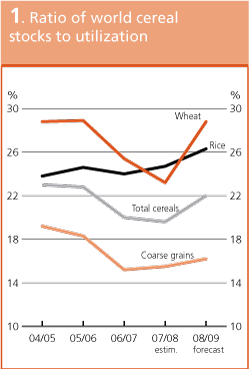 FAO global cereal supply and demand indicatorsAs evidence of some improvement in the current season (2008/09), from the particularly tight market situation in 2007/08, the ratio of world cereal ending stocks in 2008/09 to the trend world cereal utilization in the following season is expected to increase significantly to 22.0 percent. Among the major cereals, the ratio for wheat is expected to increase the most, rising to 28.8 percent from the low 23.2 percent of the previous year, following a significant increase in global production in 2008. For rice, the ratio is also expected to increase quite significantly, to reach 26.3 percent, the highest level of the past few years. Market conditions for coarse grains (maize in particular) are expected to remain the tightest. With the anticipated total utilization remaining close to world production, the stock-to-use ratio for coarse grains is forecast to increase only fractionally, to 16.2 percent, remaining close to the low level of the past two years.