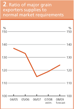 Given the outlook for a relatively strong recovery in grain production in 2008 in major exporting countries, which suffered production cutbacks in 2007, the ratio of their aggregate grain supplies compared to normal market requirements in 2008/09 is estimated to increase from the relatively low levels of the preceding two years to reach 124 percent.