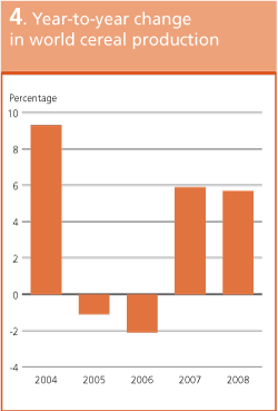 World cereal production is estimated to be up 5.4 percent in 2008, which would represent another relatively strong increase for the second year in succession, and is a welcome development in the face of the particularly tight global supply/demand situation at the outset of the 2008/09 season (July/June). However, with the first three indicators remaining relatively low, albeit slightly improved from the previous season, another good cereal harvest will be needed again in 2009 or global supplies could be quickly eroded to, or below, the reduced levels witnessed in 2006/07 and 2007/08.