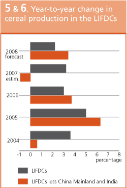 While cereal production of the LIFDCs is forecast to increase further in 2008, the rate of growth, at just 2.0 percent, would represent a decline for the third consecutive year. However, contrary to 2007, excluding China (Mainland) and India, which account for some two-thirds of the group’s aggregate cereal output, production in the rest of the LIFDCs is estimated to increase this year by 3.3 percent, this improvement is a positive feature after last year’s decline and reflects government support to improve farmers’ access to agricultural inputs and overall favourable weather conditions..