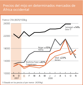 En septiembre, al llegar a los mercados las abundantes cosechas obtenidas, los precios de los cereales secundarios han comenzado a bajar; pero para noviembre de 2008 estaban muy por encima de los niveles de hace un año. Por ejemplo, pese a las bajas notables registradas en los últimos meses, en los mercados de Malí (Bamako), el Níger (Niamey) y Burkina Faso (Ouagadougou) los precios del mijo eran todavía un 23, 15 y 43 por ciento, respectivamente, más altos que en noviembre de 2007. En general, los precios internos de los cultivos no comercializables, como el mijo y sorgo, dependen de factores nacionales y regionales y fluctúan en función de la oferta y la demanda locales, en las que influyen mucho las condiciones atmosféricas irregulares. Es diferente la situación de los precios del arroz, que dependen de los precios mundiales y han exhibido un nivel alto de transferencia desde el mercado internacional. En el Senegal, el Níger y Burkina Faso los precios del arroz continuaron aumentando, siendo en septiembre más altos que el año anterior en un 85 por ciento en el Senegal, y en un 44 y 65 por ciento, respectivamente, en el Níger y Burkina Faso. Estos aumentos se produjeron a pesar de las medidas aplicadas por los gobiernos para contrarrestar el impacto de los precios mundiales más altos, como por ejemplo la exención de los aranceles de importación y las distribuciones de alimentos. En la mayoría de los países francófonos del África occidental no se observaron repercusiones en los precios debido al nivel arancelario inicial relativamente bajo y a la reciente depreciación del CFA (que está vinculado al euro) frente al dólar. Por el contrario, el Gobierno nigeriano redujo el derecho de importación para el arroz de 100 a 2,7 por ciento durante 6 meses, hasta el 31 de octubre de 2008, para las importaciones de no menos de 500 000 toneladas de arroz elaborado. Entre mayo y septiembre de 2008 se observó una importante baja de los precios en los mercados de Nigeria (por ejemplo, un 16 por ciento en el mercado de Bodija, Ibadan) debido al nivel inicial del arancel y a la valoración del naira.