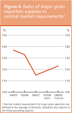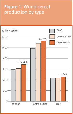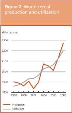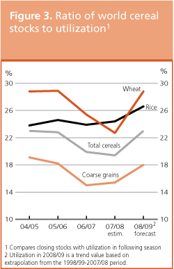 Global cereal supply and demand briefThe 2008/09 marketing season brings a significant easing of the world cereal supply and demand balance The sharp increase in world cereal production in 2008 has paved the way for a recovery in global cereal supply and demand balance in the 2008/09 marketing season. At 2 272 million tonnes, the latest forecast for world cereal production in 2008 is up 6.6 percent from 2007 and a new record. While output of all the main cereals has increased in 2008, the most significant growth has been registered for wheat (Figure 1). World cereal utilization in 2008/09 is forecast to reach 2 200 million tonnes, 3.5 percent more than in 2007/08. Thus, with production outstripping utilization by a comfortable margin (Figure 2), a substantial recovery in world cereal inventories from their critically low levels at the start of the season is foreseen. Confirming the improvement in global cereal supply and demand situation, the ratio of world cereal stocks at the close of the current 2008/09 seasons to total utilization expected in the next year is forecast to increase to 23 percent, up notably from the low of 19.4 percent in 2007/08 and closer to its longer-term average of around 24 percent. With wheat accounting for the bulk of the increase in global cereal stocks, the ratio for wheat will recover particularly strongly, while the situation for coarse grains remains relatively much tighter (Figure 3). In a sharp contrast to the situation in 2007/08, with much of the increase in cereal production occurring in major exporting countries while growth in feed and industrial utilization is slowing because of the prevailing economic crisis, export supplies are expected to rebound sharply (Figure 4). This development has put significant downward pressure on international cereal prices, particularly during the first half of the 2008/09 season.