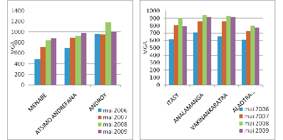 Figure 5: évolution du prix du riz blanc entre mai 2006 et mai 2009 au sud (à gauche) et dans les zones de production du centre et de l’est (à droite).