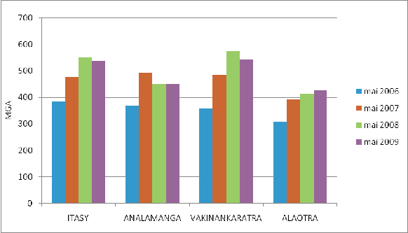 Figure 6: évolution du prix du riz paddy entre mai 2006 et mai 2009 dans les principales zones de production du centre et de l’est