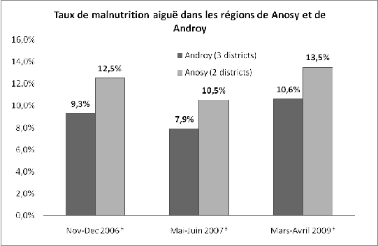 D’une manière générale il existe très peu de données sur la malnutrition des enfants de 6 à 59 mois à l’échelle nationale. Cependant, les évaluations conduites de manière ciblée sur certaines zones montrent une situation très variable. Les enquêtes menées dans le sud du pays dans 3 communes de la région d’Anosy et dans 2 communes de la région D’Androy entre Mars et Avril 2009 selon la méthodologie SMART par l’UNICEF et l’ONN montrent une prévalence de la malnutrition aiguë globale de 14,5 pour cent (13,5 pour cent selon la classification NCHS de 1977) et de 10,9 pour cent (10,6 pour cent selon la classification NCHS de 1977) respectivement à Anosy et Androy. Quant à la malnutrition aiguë sévère, elle toucherait environ 3 pour cent des enfants dans les districts enquêtés à Anosy contre 1,5 pour cent dans les districts enquêtés à Androy. Ces résultats correspondent à une situation sérieuse (entre 10 et 14 pour cent) selon le seuil de classification de l’OMS et montrent qu’elle est beaucoup plus préoccupante dans l’Anosy que dans l’Androy. Même si la comparabilité des données est limitée par les différences méthodologiques qui puissent exister dans la collecte, l’observation du graphique ci-dessous montre que quelque soit la période considérée 10 pour cent et plus des enfants de moins de 5 ans souffrent de malnutrition aiguë dans les districts enquêtés de la région d’Anosy.