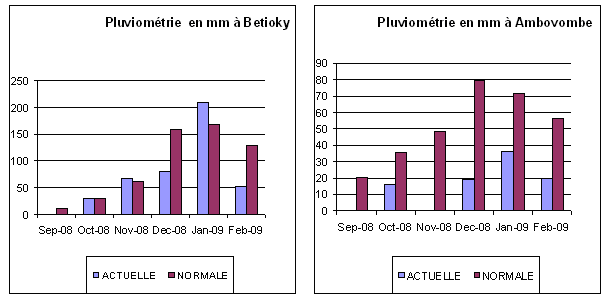 - Les pluies ont particulièrement manqué pendant la saison principale (septembre-mars). La quantité de pluies tombée entre septembre 2008 et février 2009 représentait moins du tiers de la moyenne à Ambovombe (voir figure 2), le district le plus affecté. A Ampanhy, autre district très affecté, la quantité de pluies tombée faisait moins de 50 pour cent de la moyenne. La conséquence a été une succession de resemis et un échec de la moisson principale (notamment de mais, sorgho, niébé) du mois d’avril et une prolongation de la période de soudure.