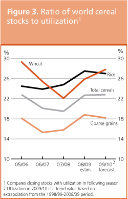 Based on the latest estimates of cereal production in 2009 and the anticipated utilization in 2009/10, world cereal stocks by the close of seasons ending in 2010 is forecast to reach 509 million tonnes, the highest level since 2002. This forecast is around 4 million tonnes higher than in the previous season mostly on account of a continuing increase in wheat stocks. At the current forecast level, the ratio of world cereal stocks to utilization, an important indicator for global food security, is expected to approach 23 percent, nearly unchanged from the previous season's level and slightly higher than its 5-year average. Given the expectation of a near record wheat production, global wheat inventories are forecast to reach 183 million tonnes, 6 percent above their already high opening levels and the largest since 2003. Most of the anticipated increase in wheat stocks is expected in China, Kazakhstan, Ukraine and the United States. Total inventories held by the major exporters are forecast to reach 52 million tonnes, up 10 percent, or 5 million tonnes, from the previous season and the highest since 2006. As a result, closing stocks of major exporters as a percentage of their total disappearance (defined as domestic utilization plus exports), another important indicator for global food security, are expected to rise to 20.4 percent, nearly 3 percent more than in the previous season and the highest in four years. This ratio hit the near historical low of less than 12 percent in the soaring price season of 2007/08. On the basis of latest forecasts for production and utilization, global inventories of coarse grains for crop years ending in 2010 are forecast to reach 205 million tonnes, down 1.8 percent from their high opening levels and still the second largest since 2001. In spite of a sharp decline in world production of coarse grains, the anticipated slower growth in total utilization is seen to limit larger drawdowns of inventories. For major exporters, ending stocks are forecast to reach 78 million tonnes, down 2 million tonnes from their opening levels but carryovers in the United States are likely to remain unchanged at around 47 million tonnes. The lower anticipated inventories in major exporters are partly offset by increases in North Africa and several Asian countries. At the current forecast level, the ratio of major exporters' stocks to their total disappearance, could decline slightly, to 13.8 percent, which would, however, be almost 2 percent points higher than its low in 2007/08. Given the anticipated decline in 2009 production, world rice reserves in 2010 are anticipated to contract to 121 million tonnes, 2 percent below their opening levels. This would still be a comfortable level equivalent to 27 percent of utilization in 2010, slightly below this year. However, because much of the stock decline is anticipated to be concentrated in the five major exporting countries, the stocks-to-disappearance ratio of this group of countries may severely deteriorate, falling from 20 percent in 2009 to some 14 percent in 2010, which would be the lowest witnessed since 2005.