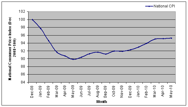 Following the adoption of the selected foreign currencies as legal tenders in the country, inflation rates have been reduced significantly, with the national Consumer Price Index increasing by only 1 percent since the abandonment of the Zimbabwean dollar (February 2009) and May 20105. However, following the deflationary period up to May 2009, pressure on prices has been building, with rising fuel costs, utility charges, wage rates and the depreciation of USD against the Rand, causing a rise in import prices in US dollar terms. Currently, inflation for 2010 is forecast at 5 percent, but it is anticipated that the inflation rate may exceed this level. Furthermore, if the shortage of foreign currency continues and the limited currency moves out of the country to pay for imported goods, inflation, and economic problems could return.