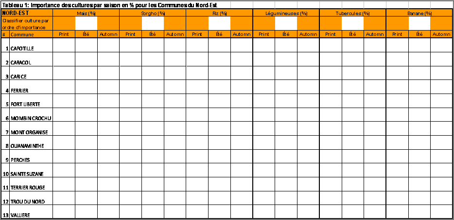 10. Le département du Nord-Est. Les terres cultivées représentent dans le nord-est seulement 25 pour cent de la superficie totale du département. On distingue trois grandes zones agroécologiques : la zone de plaine, la zone intermédiaire et la zone de montagne. Les principales cultures dans le département sont : le maïs, le riz, le haricot, la banane les pois Congo, l’arachide, les tubercules, le riz pluvial. Les saisons culturales sont au nombre de deux à trois en fonction de l’altitude.