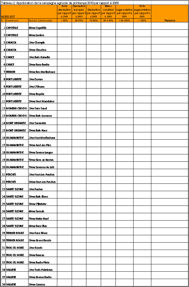 Pour la campagne de printemps 2010, les pluies ont démarré entre avril et mai, selon les zones, avec un retard de un mois à un mois et demi sur la normale. Ce retard est survenu après une période particulièrement sèche durant l’hiver 2009/10, sauf au sud, où l’on a noté des pluies importantes en janvier 2010. Dès le démarrage des pluies en avril/mai, celles-ci ont été généralement plus abondantes que la normale sauf dans le Nord-Ouest, dans certaines Communes de l’Artibonite, ainsi que dans la région de l’épicentre du tremblement de terre. Ce retard des pluies s’est traduit par des réductions des surfaces cultivées durant la campagne de printemps, qui seront en partie compensées par la campagne d’été grâce aux bonnes pluies généralisées de juin/début juillet.