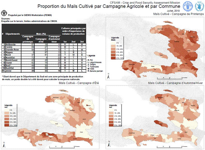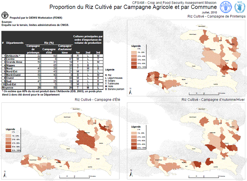 Selon les zones agro-écologiques, on distingue trois campagnes principales: la campagne de printemps dont la récolte à lieu de juin à fin août, la campagne d’été dont la récolte à lieu en septembre/octobre et la campagne d’automne dont la récolte a lieu de janvier à mars. La campagne de printemps représente environ 50 pour cent da la production nationale du maïs, sorgho, légumineuses, tubercules et bananes plantains. Pour le riz, la campagne d’été représente plus de 50 pour cent, essentiellement dans la Vallée de l’Artibonite.
