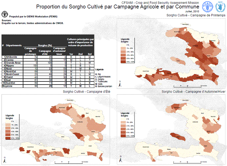 Une Mission FAO/PAM d’évaluation des récoltes et de la sécurité alimentaire a séjourné en Haïti du 16 juin au 13 juillet 2010 pour estimer la production vivrière de la saison de printemps 2010 et les prochaines récoltes des saisons d’été et d’automne/hiver ainsi que les besoins d’importations céréalières pour l’année commerciale 2010/11. Les techniciens du Ministère de l’agriculture, des ressources naturelles et du développement rural (MARNDR) ont prêté leur concours à la Mission dans la capitale Port-au-Prince et sur le terrain. En particulier, les responsables de l’unité d’Étude et de programmation et du service statistique du MARNDR ainsi que la Coordination nationale de la sécurité alimentaire (CNSA) avec leur structure d’Observatoires, ont participé activement aux tâches administratives et aux activités sur le terrain et ont fourni des renseignements détaillés sur la situation alimentaire actuelle et à venir.