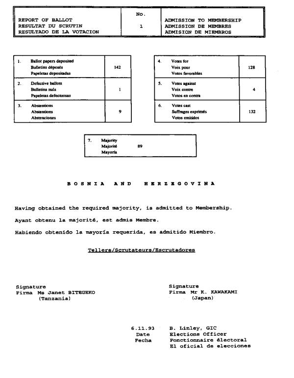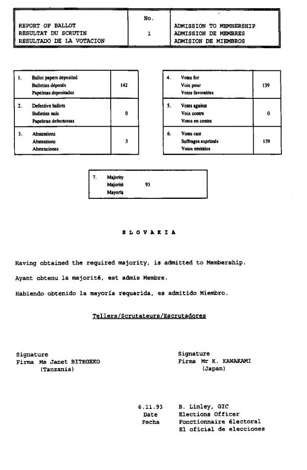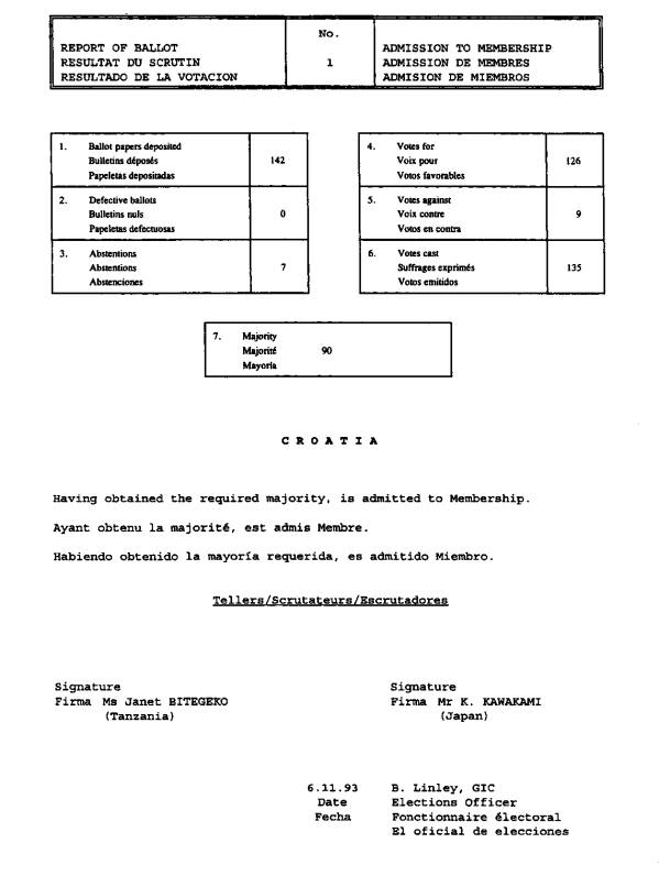 CHAIRMAN: Under the provisions of Rule XII of the General Rules of the Organization, the quorum required for this election is a majority of the Member Nations of the Organization. This means that at least 85 Member Nations must be present in the hall at this time. I have requested the Officers in charge of the election to carry out a count and I am told that at this time there are at least 144 delegations of Member Nations present. We may therefore proceed to the vote.