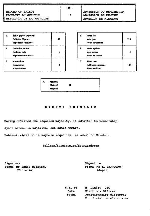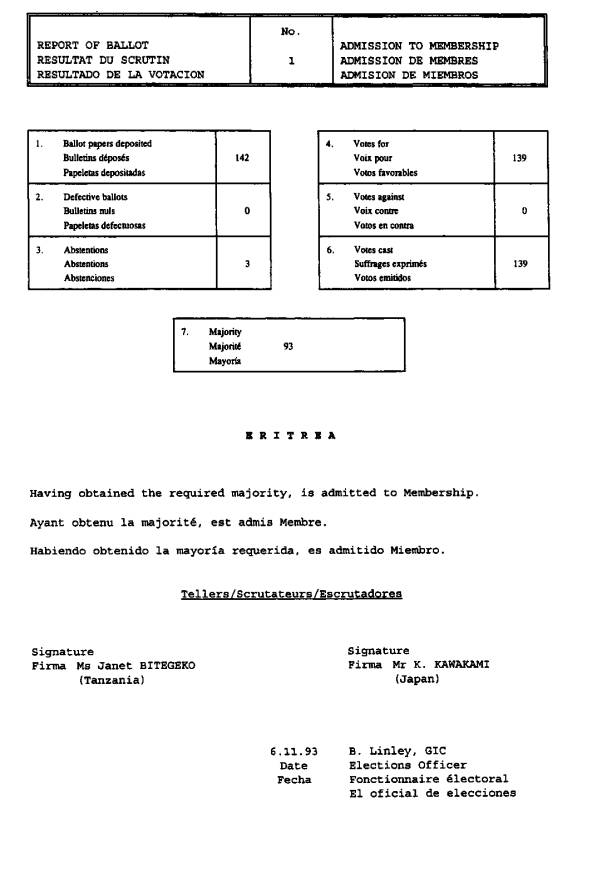 LE SECRETAIRE GENERAL: Je vais donner lecture du résultat du scrutin pour l'admission d'Etats Membres.