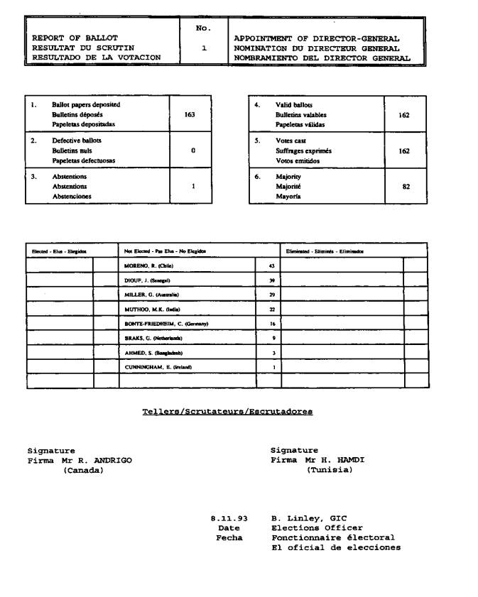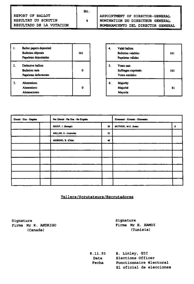 CHAIRMAN: We move to item 27.1, the appointment of the Director-General. There were nine candidates for the post as indicated in document C 93/18. However, as indicated in document C 93/18-Corr.1, the Government of Greece has withdrawn the candidacy of Mr Politis. Accordingly, there are now eight candidates, namely Mr Salahuddin Ahmed, Mr Christian Bonte-Friedheim, Mr Gerrardus J.M. Braks, Mr Edward Patrick Cunningham, Mr Jacques Diouf, Mr Geoff Miller, Mr Rafael Moreno, Mr Maharaj Muthoo.