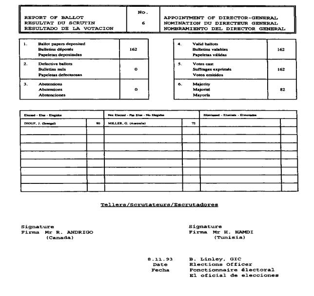 The vote is governed by Art. VII.1 of the FAO Constitution, which reads as follows: "There shall be a Director-General of the Organization who shall be appointed for a term of six years. He shall be eligible for re-appointment". Delegates, the voting will be by secret ballot and, in order to be appointed, the successful candidate must obtain a majority of the votes cast as specified in Rule XXXVI-l (b) of the General Rules of the Organization.