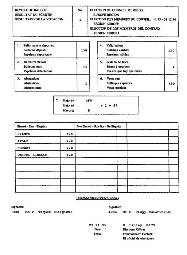 We will now proceed to vote to fill the seat in the Europe Region vacated by the former Czechoslovakia. This seat will be filled for the period November 1993 to November 1995, that is to say the remainder of the term of office, 1 January 1993 to November 1995.