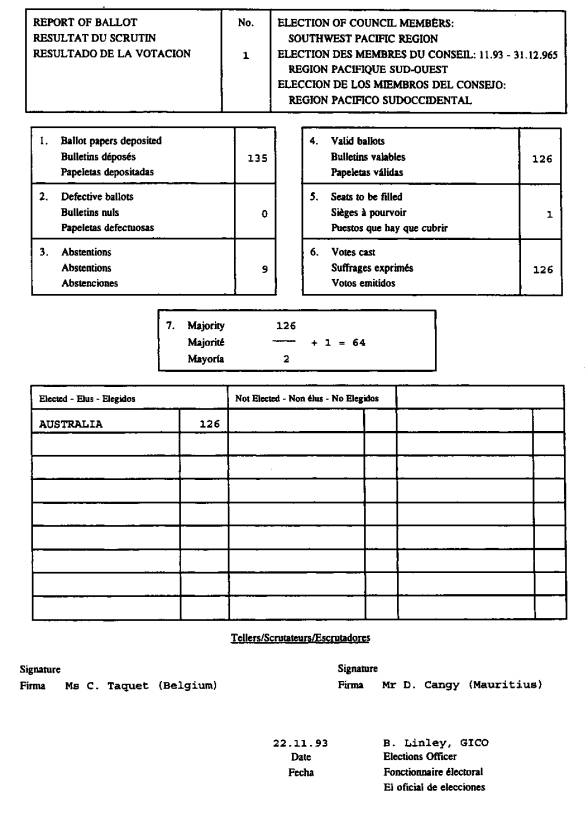 CHAIRMAN: Before we proceed to the vote, I would like to say to the Conference that it is proposed that during the counting of the ballots we invite you to accept Draft Report Part II contained in document C 93/REP/2, also C 93/REP/3, which is a Draft Report from Commission I, also C 93/REP/4 and possibly C 93/REP/5. If, in between the counting of the votes, it is possible to deal with these Reports, I will invite Conference to do so.