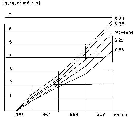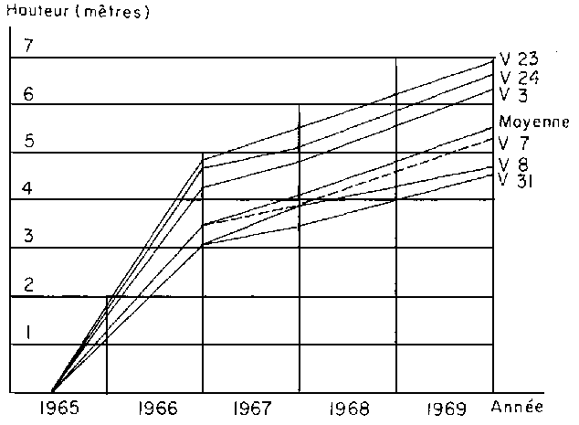 Une deuxième collection contenant 20 clones a été établie en 1965. Certains de ces clones sont des répétitions de la première collection. Cette seconde collection est également évaluée tous les ans et l'on observe de près toute variation clonale éventuelle. Le développement des clones les plus grands et les plus petits est illustré à la figure 3. Bien qu'apparemment les clones n'accusent pas une différence frappante sur le plan de la croissance en hauteur, on remarquera que le V 8 à floraison précoce et le clone V 31 de l'arbre moins sont petits.