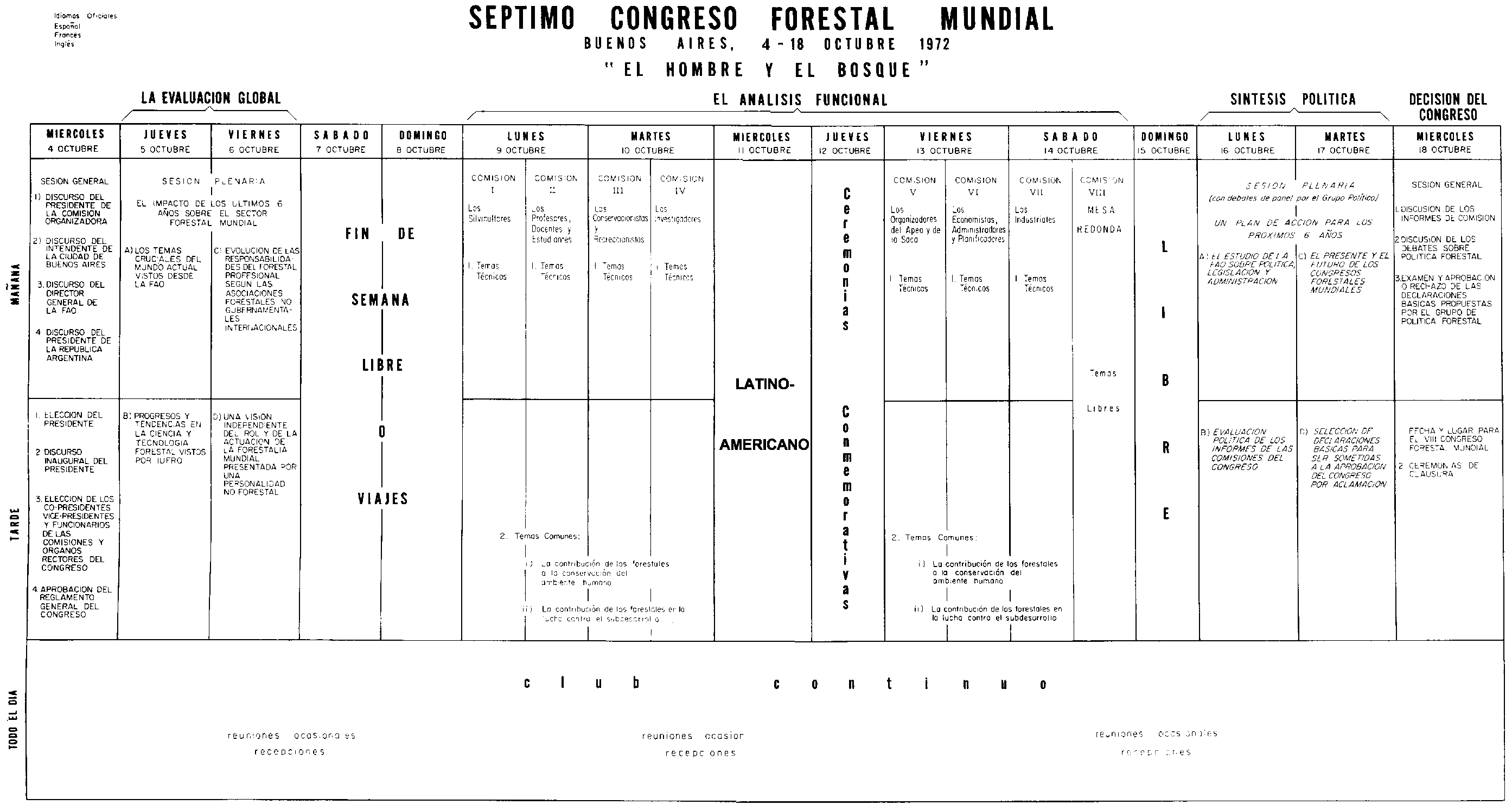 La primera sesión plenaria será dedicada a la discusión del estudio básico de la FAO La Política, la Ley y la Administración Forestal, cuya versión final deberá ser publicada en 1973 y que incorporará las hechas por el Congreso.