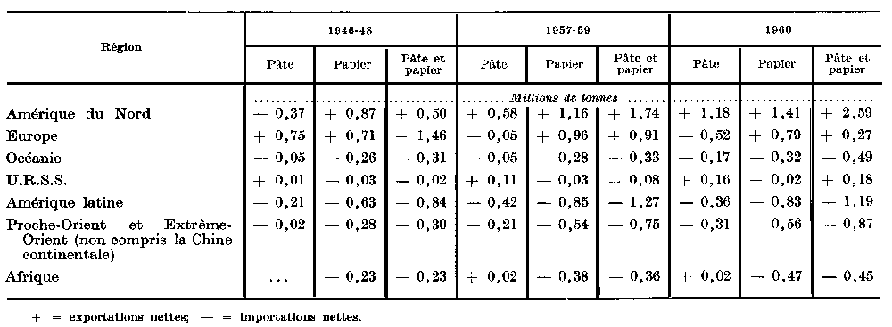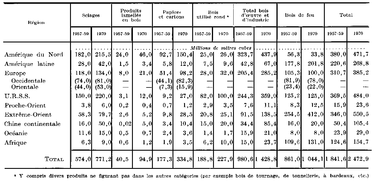 On sait, d'après des études récentes et les études en cours, que les besoins mondiaux en bois d'uvre et d'industrie (c'est-à-dire le bois destiné aux utilisations autres que le chauffage) augmenteront de façon marquée - peut-être de 50% d'ici 1970 (tableau 11). L'augmentation est variable selon les régions, et la structure de la consommation, qui s'est sensiblement modifiée depuis la dernière guerre et diffère aussi beaucoup d'une région à l'autre, continuera à changer. Dans toutes les régions, la demande de produits de pâte et de produits lamellés en bois (contre-plaqués, panneaux de particules et panneaux de fibre) augmentera plus vite que la demande de sciages (qui resteront cependant au premier rang parmi les bois usinés entrant dans la consommation), tandis que la demande de bois consommé sous sa forme originale de bois rond (étais de mine, perches, poteaux, pieux, etc.) progressera peu. Les régions les plus importantes continueront, comme elles le font actuellement, à couvrir entièrement ou pour une bonne part leurs besoins en produits forestiers avec la production de leurs forêts, bien qu'on ne puisse en dire autant pour beaucoup de pays considérés individuellement. Toutefois, le volume du commerce interrégional des produits forestiers, déjà important actuellement, pourrait augmenter encore.