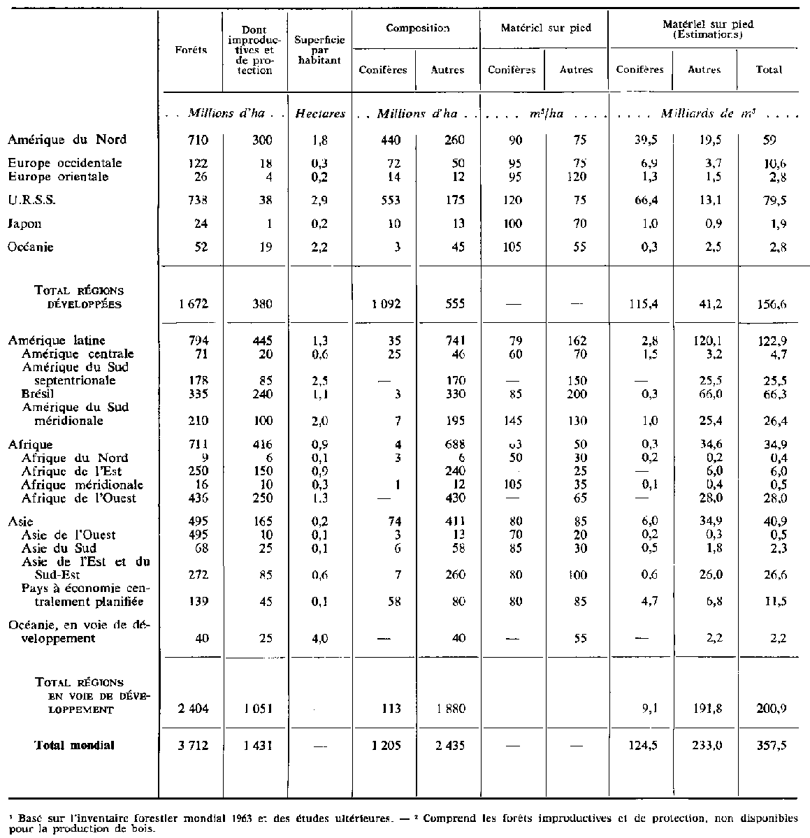 A l'heure actuelle, une partie seulement de la superficie forestière du monde est utilisée. Néanmoins, toute étude doit tenir compte de toutes les forêts susceptibles d'être productives. Le tableau 1 résume les ressources mondiales forestières. Il montre l'énorme richesse forestière de l'Amérique du Nord et de l'Amérique latine ainsi que de l'U.R.S.S. Ces trois régions sont celles qui possèdent le plus gros volume de bois sur pied. L'Afrique possède à peu près la même superficie forestière que l'Amérique du Nord mais guère plus de la moitié du volume sur pied nord-américain. Les types forestiers vont de la savane ouverte, faciès naturel des forêts dégradées d'Afrique, d'Asie et du Pacifique, aux peuplements vierges des grandes forêts de l'Amérique du Nord, de l'Amérique latine et de la Russie.