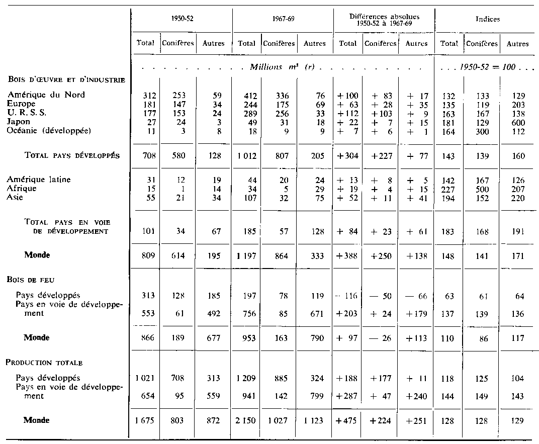 3. La production mondiale de bois a augmenté d'environ 25 pour cent entre 1950-52 et 1967-69 pour atteindre plus de 2 milliards de mètres cubes par an, mais même ainsi elle ne représente qu'un peu plus de 0,5 pour cent des réserves mondiales estimatives. Le taux d'accroissement dans les pays en développement (près de 45 pour cent au cours de cette période) a été beaucoup plus rapide que dans les pays industrialisés (15 pour cent), mais ces derniers produisaient encore près de 85 pour cent du bois industriel en 1967-69.