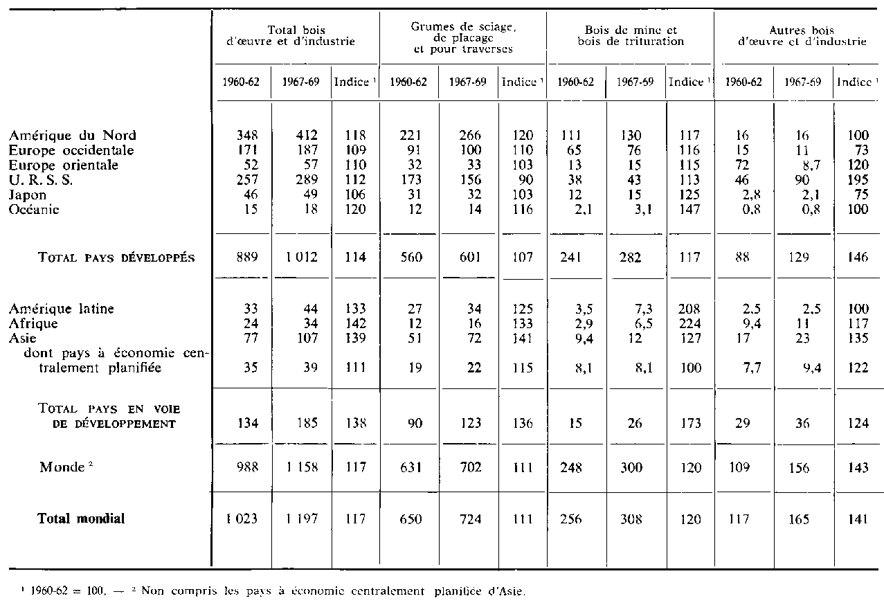 L'augmentation absolue de la production de grumes à usage industriel a atteint son maximum en U.R.S.S. Cependant, quantitativement, l'Amérique du Nord reste de loin la principale région puisqu'elle a assuré plus du tiers de la production mondiale.