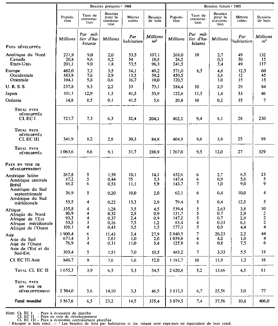 Le tableau annexe 1 indique les données économétriques qui ont servi au calcul des besoins en bois pour 1968 (moyenne 1967-69) et à leur estimation pour 1985, sur la base des principales hypothèses énoncées plus haut. Sans doute plusieurs de ces hypothèses, en particulier, en ce qui concerne les régions en voie de développement, sont-elles contestables, étant parfois fondées sur des renseignements incomplets et sur les données disponibles au moment de la rédaction du présent rapport. Ce tableau permettra cependant de réviser les calculs effectués lorsqu'on disposera de renseignements plus précis. On sait que l'Amérique du Nord et le Japon publieront prochainement de nouvelles études sur les tendances et perspectives du bois. Les résultats de ces études et d'autres renseignements utiles pourront facilement être insérés dans le présent tableau et dans le tableau 10.