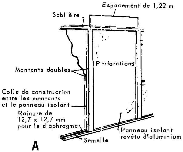 Ce système d'ossature original est basé sur cinq éléments illustrés à la figure 1. Le système d'ossature des murs utilise des montants de 2 x 4 pouces en bois de deuxième choix, placés à plat de part et d'autre d'un diaphragme de panneau de fibres qui sert de raidisseur et d'isolant thermique et phonique. Un élément de revêtement mural intérieur utilise un panneau de plâtre. Comme l'élément est prévu pour une portée de 4 pieds, il est renforcé par des planches de 1 pouce collées au panneau de plâtre. Un troisième élément, la ferme, est conçu pour être posé à des intervalles de 4 pieds. La construction présente de nombreux avantages pour la fabrication et le transport. Les revêtements extérieurs pour les murs et le toit sont une combinaison de matériaux conçus pour ne nécessiter qu'une seule couche au lieu des deux normalement utilisées.