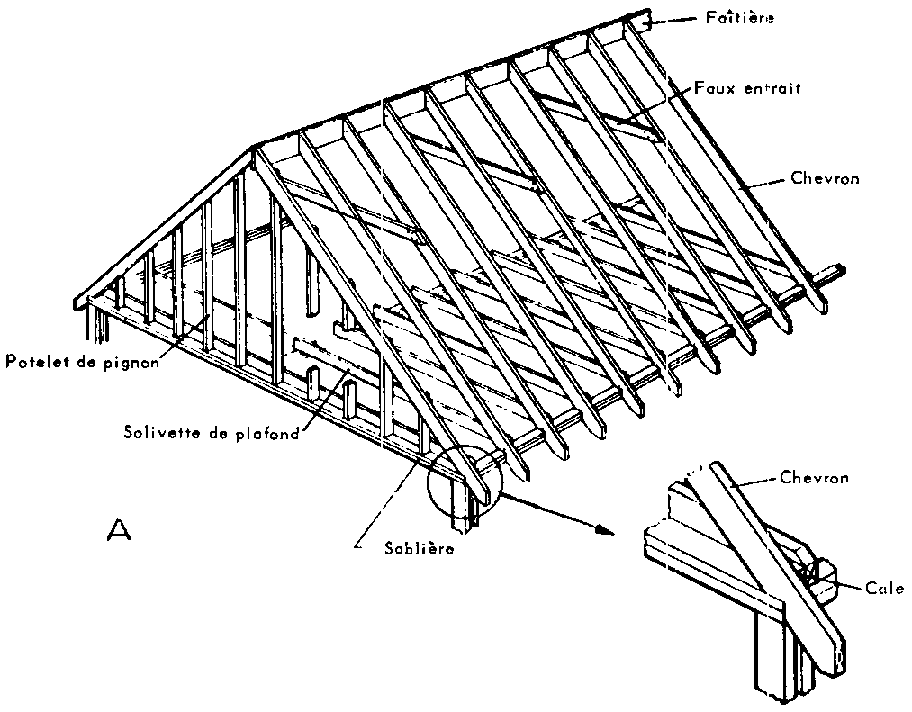 L'ossature du toit comportait habituellement des chevrons de toit supportés par les murs et réunis au centre à la faîtière (figure 4). Les chevrons sent cloués aux solives du plafond. Cette construction est maintenant souvent supplantée par des fermes légères (fermes à chevrons) réalisées avec du bois de dimension L'utilisation des fermes à chevrons simplifie la construction car elles peuvent être mises en place comme un élément unitaire et ne nécessitent pas de murs intérieurs pour supporter les solives du plafond.