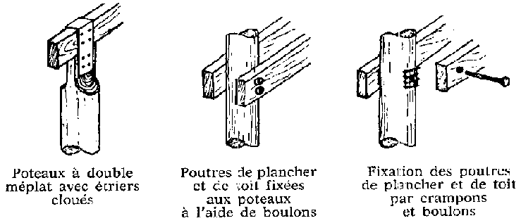 6. Il est indispensable d'appliquer de bonnes méthodes d'assemblage des éléments de maison et d'employer Les moyens les plus simples pour une fin déterminée. En général, les clous sont plus satisfaisants et il n'y a qu'à prévoir des formes d'assemblage supplémentaires, notamment les brides ou les boulons, dans les régions particulièrement exposées aux risques d'ouragans, de typhons ou de tremblements de terre. Les procédés d'assemblage plus perfectionnés, notamment ceux qui demandent des produits adhésifs ou des organes d'assemblage spéciaux pour bois d'uvre, ne devraient servir que dans les ouvrages complexes ou dans les pays suffisamment industrialisés. Il a été noté qu'il faudrait étudier l'assemblage de bois très denses. La Consultation rappelle aux architectes et constructeurs des pays en développement qu'il est bon d'employer, pour obtenir une stabilité et une résistance données, les méthodes d'assemblage les plus simples possibles.