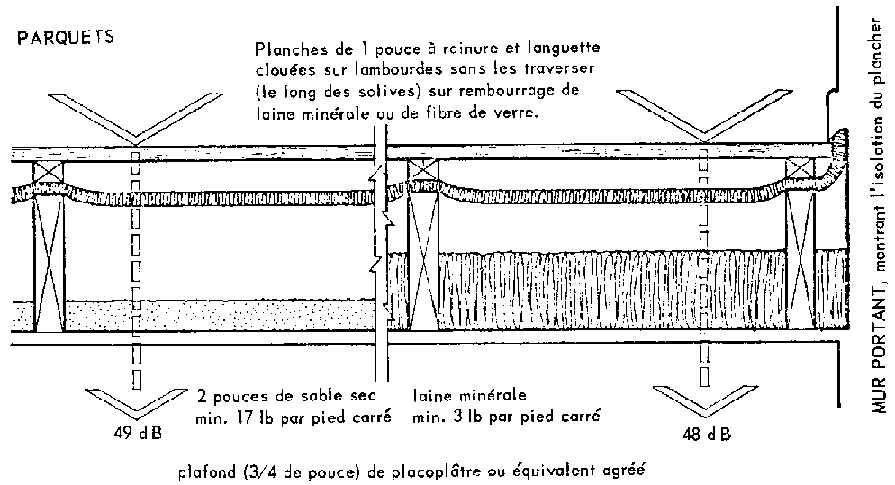 i) Construction tout en bois possible, mais généralement avec réglementations plus strictes. L'isolation phonique des planchers de séparation en éléments à base de bois est plus difficile que celle des murs de refend |