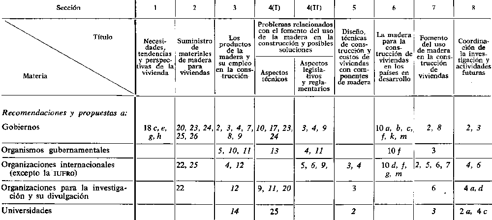 Si bien en las secciones de la Consulta figuraban temas concretos para los debates, fue inevitable, dada la amplia variedad de disciplinas abarcadas, que muchos problemas se debatieran en más de una sección. Esto condujo a una presentación de los resultados y recomendaciones que reflejaba la interdependencia de múltiples sectores. Por tal razón, y como ayuda para el lector interesado en aspectos particulares, se da el cuadro siguiente de remisiones y concordancias entre resultados, conclusiones y recomendaciones contenidos en los informes de las secciones técnicas.