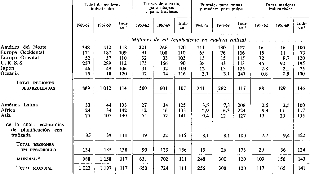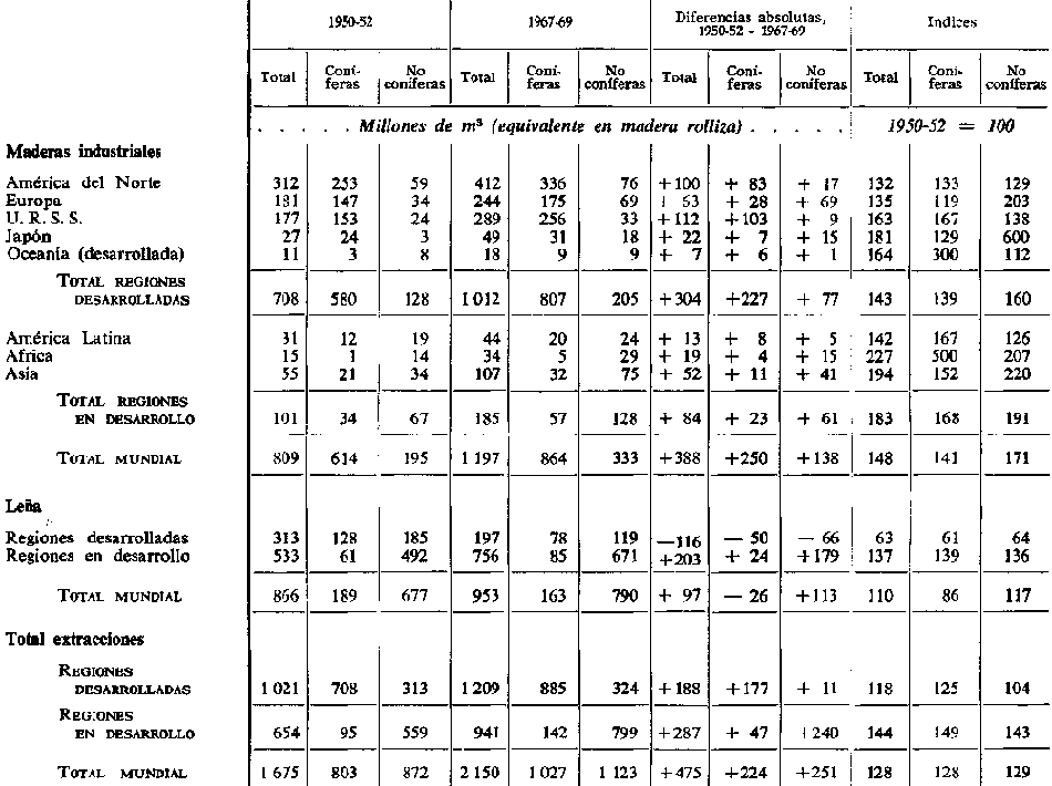 3. La producción mundial de madera aumentó en un 25 por ciento aproximadamente entre 1950/52 y 1967/69, pasando de 2000 millones de m3 por año, pero este nivel de aumento representa todavía poco más del medio por ciento de las existencias en formación mundiales estimadas. El ritmo de crecimiento en las regiones en desarrollo (aproximadamente el 45 por ciento durante ese periodo) ha sido mucho más elevado que en las regiones desarrolladas (un 15 por ciento) pero casi el 85 por ciento de la madera industrial en 1967/69 se seguía produciendo en las regiones desarrolladas.