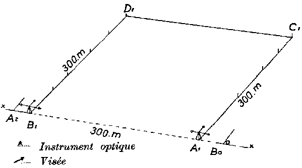 L'opération consiste à partager le carré en trois parties égales par deux parallèles à la base A1-B1 et à piqueter ces lignes ainsi que les bases tous les 3 m.
