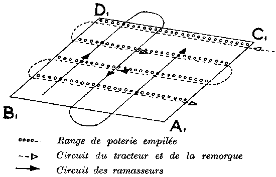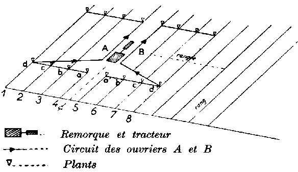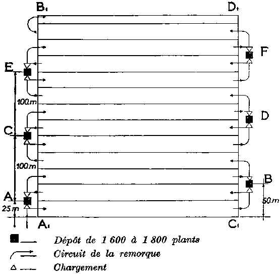 L'équipe de distribution (tracteur avec conducteur, remorque avec deux ouvriers et huit distributeurs) va et vient à travers les rangs. Elle traverse ainsi 13 fois l'élément en rechargeant à chaque extrémité (voir fig. 7). La disposition rationnelle des dépôts est la suivante: trois dépôts de 1600 à 1800 plants environ sur le côté A1-B1, le premier à 25 m de l'angle Al, les deux autres (C et E) distants de 100 m du précédent; trois dépôts sur le côté C1-D1, le premier (B) à 50 m de l'angle C1, les deux autres D et F à 100 m d'intervalle.