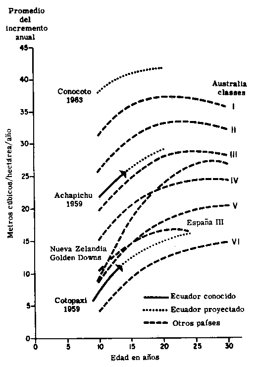 De este modo, sobre la base de la muy limitada información disponible, parece mejor comparar el crecimiento de P. radiata en el Ecuador con el de otros países. El crecimiento de altura en la parcela de muestreo de 1963 en Conocoto se equipara a la mejor información publicada en cualquier otra parte del mundo, y los árboles de 1955 indican que los resultados probablemente serán mantenidos. Al otro extremo de la balanza, la plantación de 1963 en Cotopaxi tiene un índice más lento de crecimiento que el dado por cualquier otra información publicada o conocida por el autor.