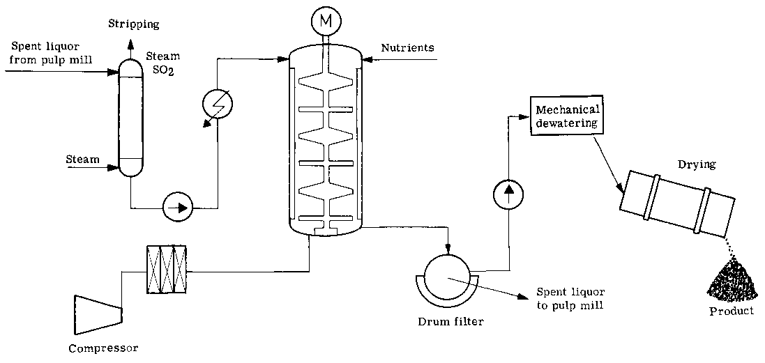 The simplicity of the Pekilo process is striking. In SCP production a dilute solution of the carbohydrates constituting the raw material is normally given a preparatory treatment before fermentation. But if spent sulfite liquor is used as the carbohydrate source the only preparatory treatment necessary is contact with steam in a reaction tower in order to remove sulfur dioxide. After cooling, the liquor goes into a fermenting vessel, together with other nutrients essential for the support of the organism.