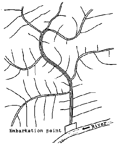 These give access to the area in the process of exploitation, merging into the main road. Their function consists in carrying the timber felled during one or two seasons only. Their length of service, as far as the transport of logs is concerned, may be but a matter of months - two years at the most. In exceptional circumstances these secondary roads can carry traffic required by the general needs of exploitation (transport of equipment, camping requirements, etc.). Thus, as will be seen later on, at the beginning of each season, at least one secondary road should be prepared in advance, so that the surface has the chance to settle anyway during one rainy season.