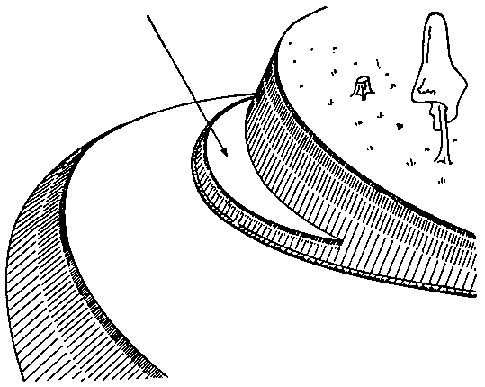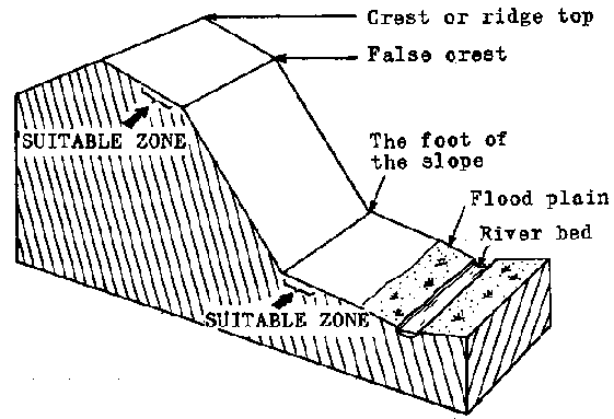 3. On a hillside, especially in regions of marked topography, the least steep slopes must be looked for (Figure 21). The top of the steepest part of the slopes is usually a line where the gradient changes (the false crest); this line borders the plateau and an endeavor should be made to build the road along it. Near the base, especially in valleys with a flat bottom, the road can be made immediately below or close to the foot of the slope.