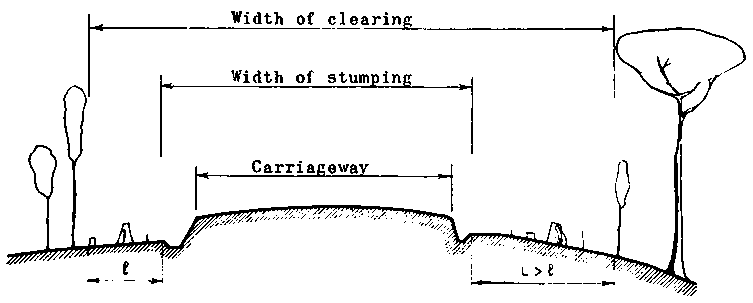 The conception of the road reserve arises only in areas where rights of property or occupation are demarcated on the ground. The roadway corresponds to the width of stumping in places where the road passes through wooded areas. The formation is wide enough to allow passing or overtaking of vehicles on single track roads. The carriageway of a forest road is nearly always a single track because of the relatively small number of vehicles using it each day.