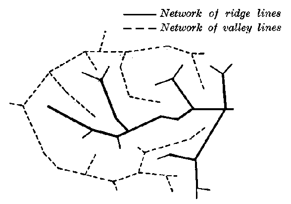 The first thing is to look for saddles, that is, places where the ridges can be crossed. One of the preceding cases will apply where, by using a normal alignment, successive slopes can be cut through obliquely by a line on a uniform gradient and a combined profile.