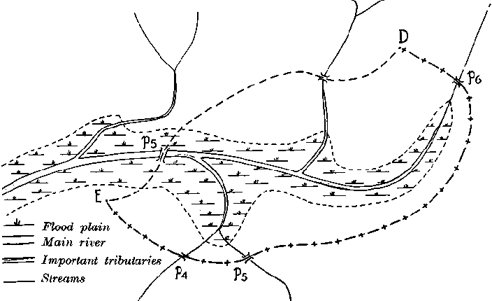 Essential points to remember. When considering a crossing over a watercourse, a check must be made that there is not another place nearby which had been overlooked when the map was studied and which would be more suitable. To determine the highest flood level of the water the masses of debris brought down by the floods should be looked for, and also traces of slime left on the stems of plants in the neighborhood. If it likely that the route will cross the line of a ridge or a watershed between two valleys, the line of the main ridge and the lines of the secondary ridges or spurs are walked over systematically. It is often essential to work up the valleys with the reconnaissance equipment to discover the highest part suitable for a crossing. The relative heights of the characteristic high and low points are read on the barometer.