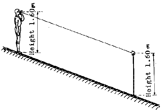 The head of the party, carrying the clinometer, begins by measuring the height of his eye above the ground when he is using the instrument to measure a gradient; say, for example, it is 1.60 meters. He puts a square of white paper (or newspaper) from 5 to 10 centimeters wide at the same height on a staff or a very straight stick. To read on the clinometer the gradient of the line joining the bearer and the bearer of the staff it is enough to be able to see the square of paper. The line of sight between the eye of the operator and the square of paper is parallel to the line which joins the two stations (Figure 19). An experienced operator would be content to note on the man carrying the staff the point of his hat or of his face which corresponds to the same height of the clinometer (Figure 18); this avoids using a staff which it is not always easy to hold upright.