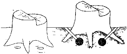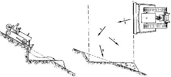 Trabajando con bulldozer, en el caso de árboles de diámetro de 40 a 50 cm., lo más económico suele ser desarraigar el árbol entero en lugar de derribar el árbol antes de desceparlo; con ello el poso de la copa facilita la caída después de seccionar las raíces. En términos generales, no debe tratarse de derribar estos árboles atacándolos directamente, como en el caso de los de diámetro medio. El mejor resultado se obtiene seccionando previamente las raíces laterales. A menos de que el árbol sea muy grueso, no es necesario seccionar las raíces correspondientes al lado de la caída. La sucesión de operaciones recomendadas es la siguiente (Figura 26):